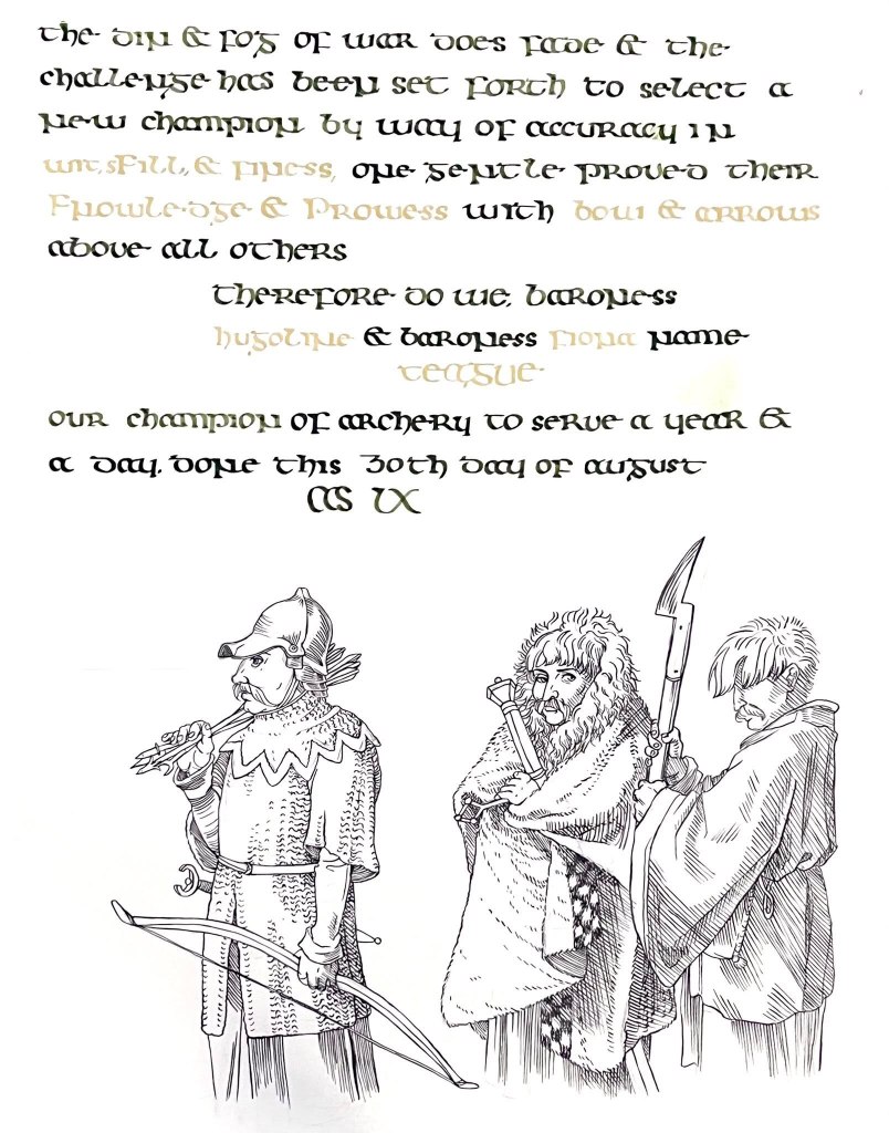My Calligraphy with Osanna Schade’s illumination/illustration. Insular Majuscule script done with oblique dip pen, acrylic Juniper Moss colored and Mica Gold inks.